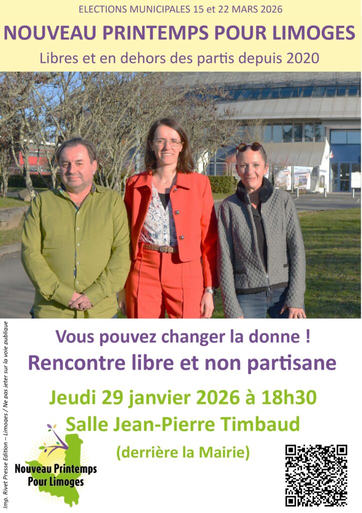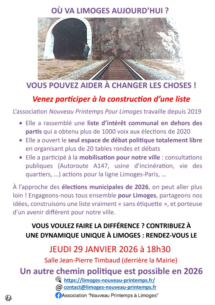 Le jeudi 29 janvier prochain, à 18h30, salle Jean-Pierre Timbaud, dans le même esprit qui nous a guidé en 2020, nous organisons une nouvelle rencontre, libre et ouverte à tous les Limougeauds et Limougeaudes désireux de participer à la construction de cette liste.
